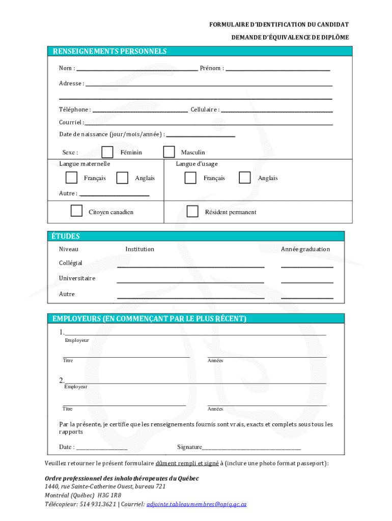 FORMULA IRE IDENTIFICATION DU CANDIDATE DEMAND EQUIVALENCE DE DIPLMERENSEIGNEMENTS PERSONNEL Not : Prom : Address : Tl phone : Cellular : Courier : Date de Renaissance (four/moist/Anne) : See :Large