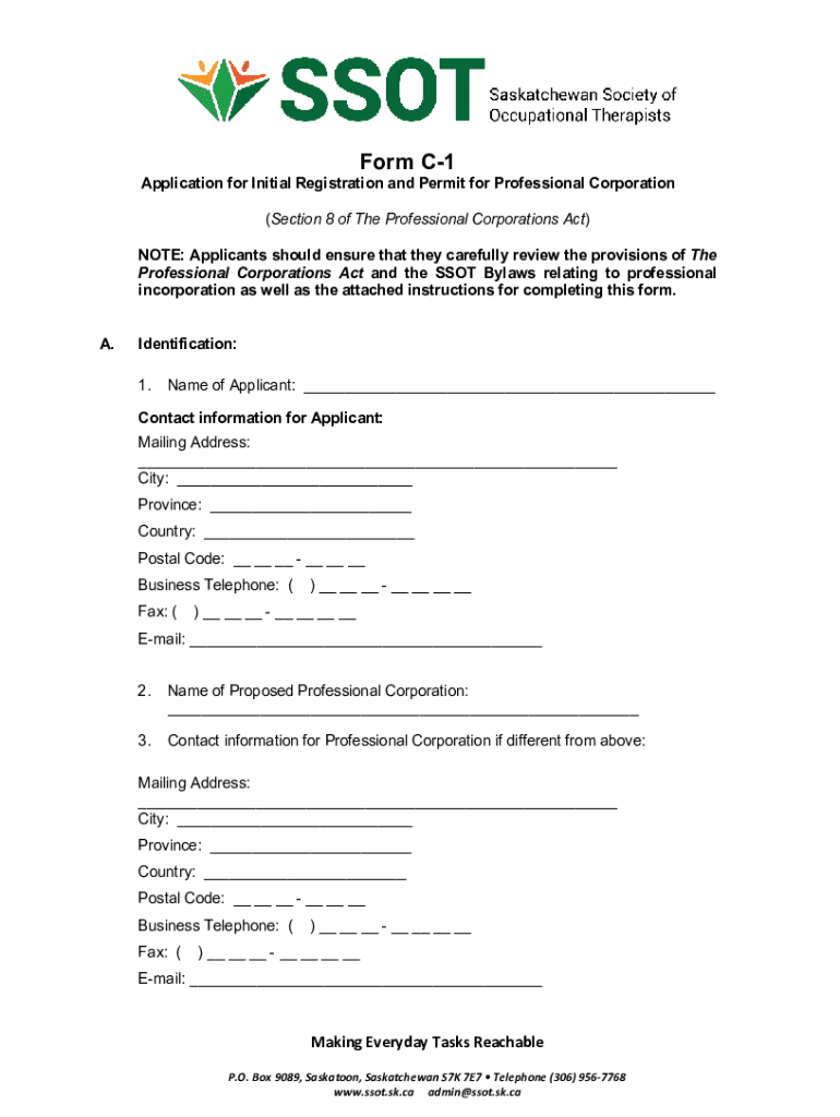 Form C1Application for Initial Registration and Permit for Professional Corporation (Section 8 of The Professional Corporations Act) NOTE: Applicants should ensure that they carefully review the provisions