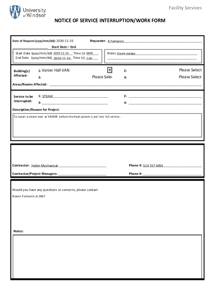 Facility ServicesNOTICE OF SERVICE INTERRUPTION/WORK Format of Request (YYY/mm/dd): 20201110 Requester: R FontaniniStart Date Endgame date Interruption/Closure 20201110 0600 Start (YYY/mm/dd) Time