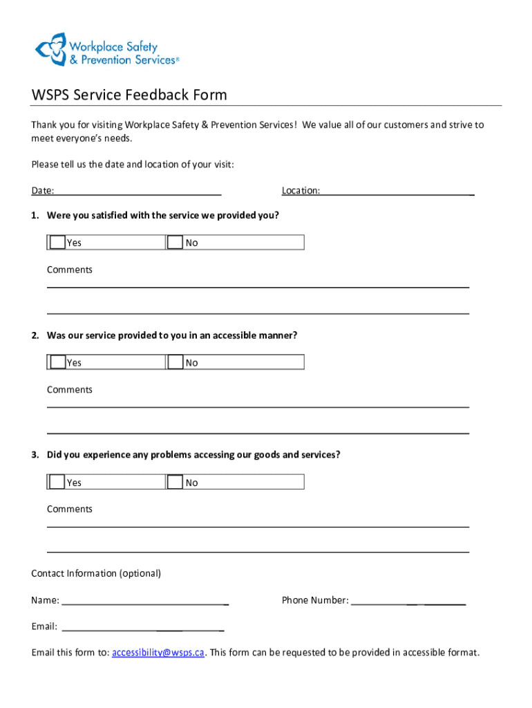 WSPSServiceFeedbackFormThankyouforvisitingWorkplaceSafety&PreventionServices! Wevalueallofourcustomersandstriveto meeteveryonesneeds. Pleasetellusthedateandlocationofyourvisit: Date: Location: 1.
