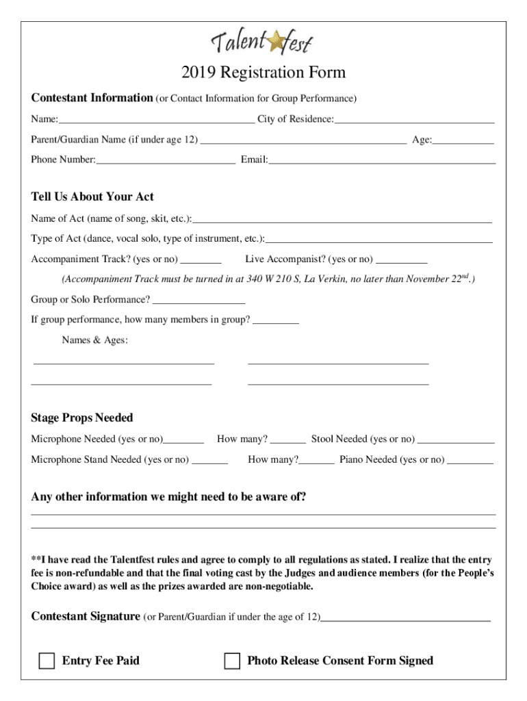 2019 Registration Form Contestant Information (or Contact Information for Group Performance) Name: City of Residence: Parent/Guardian Name (if under age 12) Age: Phone Number: Email: Tell Us About