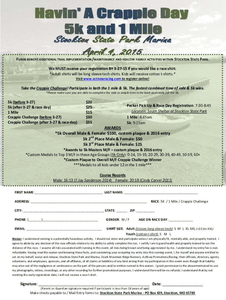 FUNDS BENEFIT ADDITIONAL TRAIL IMPLEMENTATION/MAINTENANCE AND HEALTHY FAMILY ACTIVITIES WITHIN STOCKTON STATE PARK. We MUST receive your registration BY 32715 if you would like a race shirt. *Adult