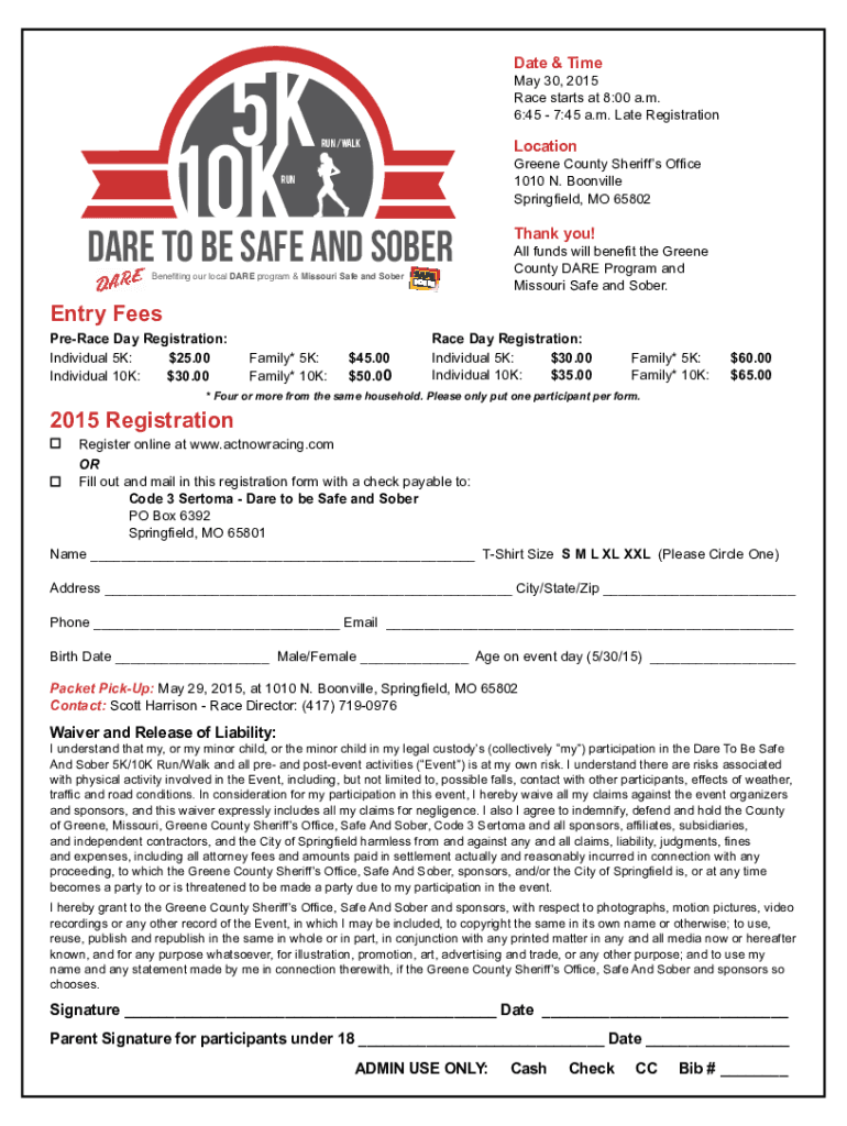 5K 10K Dare to be Safe and Sober run/walkrunBenefiting our local DARE program & Missouri Safe and Coherently FeesPreRace Day Registration: Individual 5K:$25.00Individual 10K: $30.00Family* 5K:$45.00