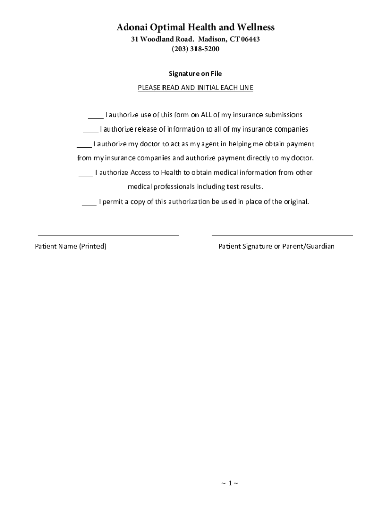 Adana Optimal Health and Wellness 31 Woodland Road. Madison, CT 06443 (203) 3185200 SignatureonFile PLEASEREADANDINITIALEACHLINE IauthorizeuseofthisformonALLofmyinsurancesubmissions Iauthorizereleaseofinformationtoallofmyinsurancecompanies