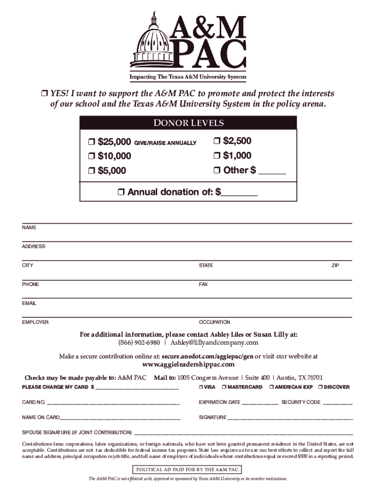 Yes! I want to support the A&M PAC to promote and protect the interests of our school and the Texas A&M University System in the policy arena. DONOR LEVELS $25,000 Give/Raise Annually $$2,5005,000