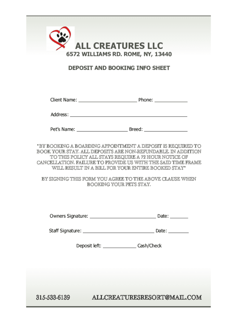 ALL CREATURES LLC6572 WILLIAMS RD. ROME, NY, 13440 DEPOSIT AND BOOKING INFO SHEETClient Name: Phone: Address: Pets Name: Breed: *BY BOOKING A BOARDING APPOINTMENT A DEPOSIT IS REQUIRED TO BOOK YOUR