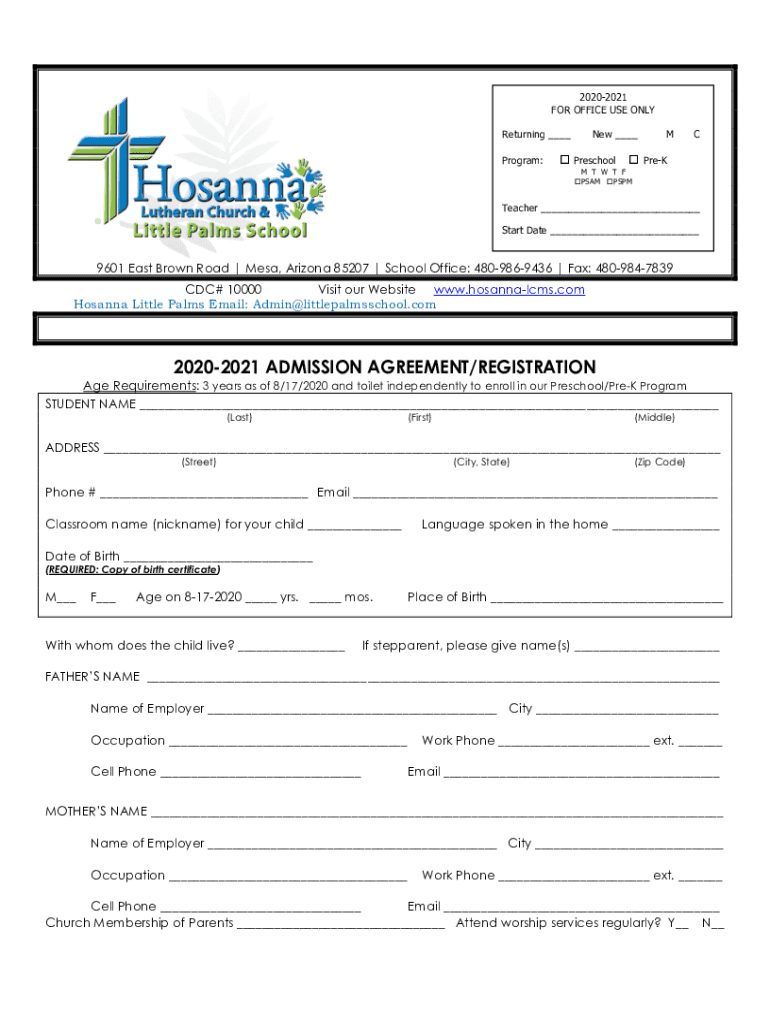 20202021 FOR OFFICE USE ONLY Returning Program:New Preschool MC Poem T W T FP SAM PSPMTeacher Start Date 9601 East Brown Road Mesa, Arizona 85207 School Office: 4809869436 Fax: 4809847839 CDC# 10000