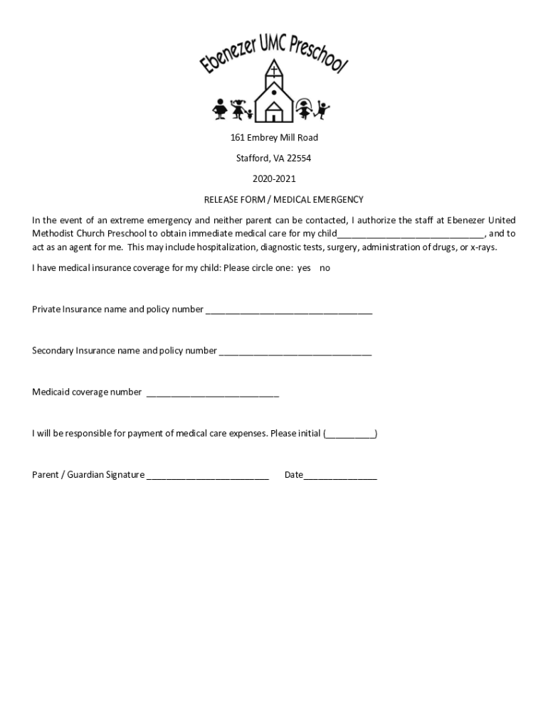 161 Umbra Mill Road Stafford, VA 22554 20202021 RELEASE FORM / MEDICAL EMERGENCY In the event of an extreme emergency and neither parent can be contacted, I authorize the staff at Ebenezer United