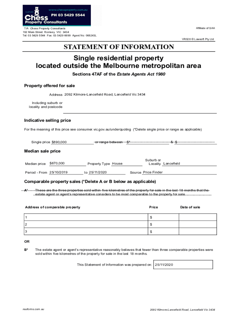 Affiliate of SEAT/A Chess Property Consultants 102 Main Street Ramsey VIC 3434 Tel: 03 5429 5544 Fax: 03 5429 6699 Agent No: 068243LVR028 Law soft Pty Statement OF INFORMATION Single residential property
