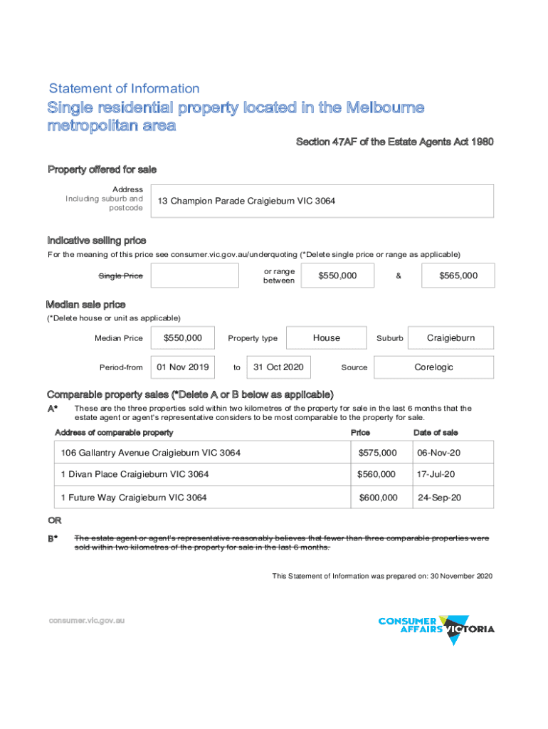 Statement of InformationSingle residential property located in the Melbourne metropolitan area Section 47AF of the Estate Agents Act 1980 Property offered for sale Address Including suburb and postcode13