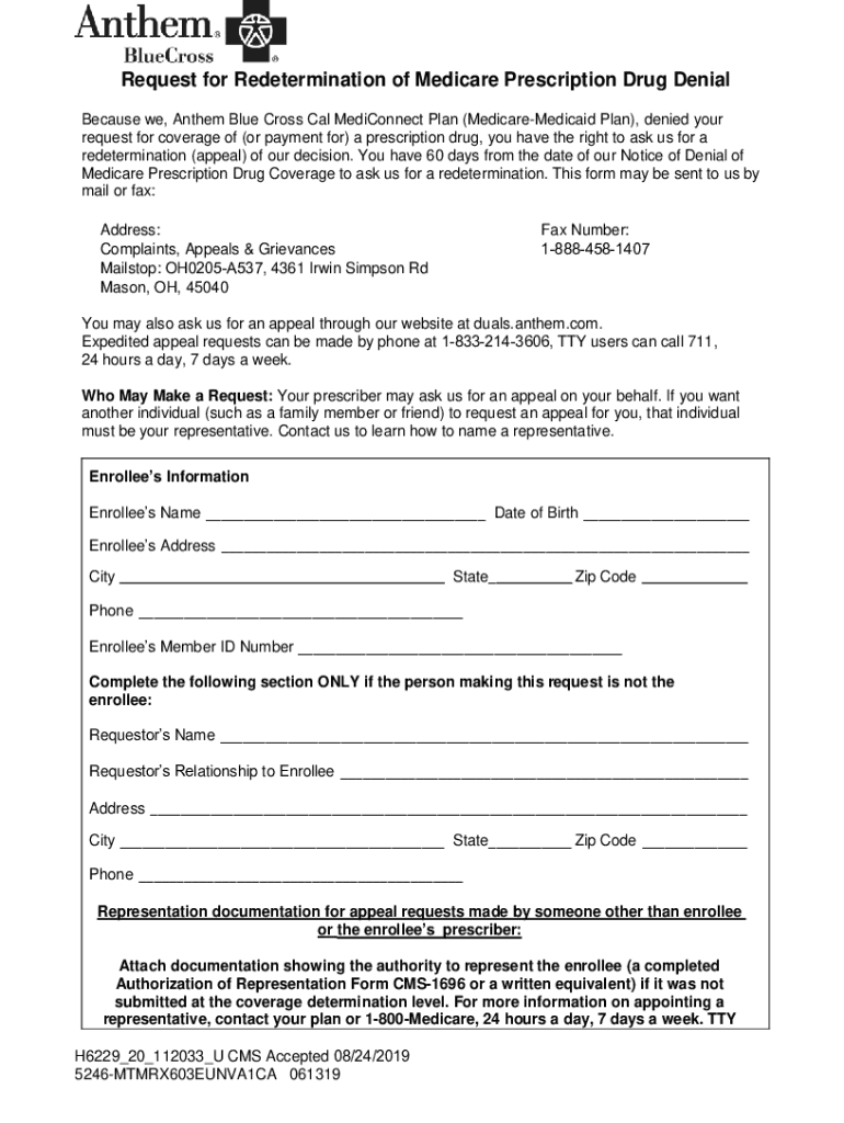 Request for Redetermination of Medicare Prescription Drug Denial Because we, Anthem Blue Cross Cal Disconnect Plan (Medicare Medicaid Plan), denied your request for coverage of (or payment for) a