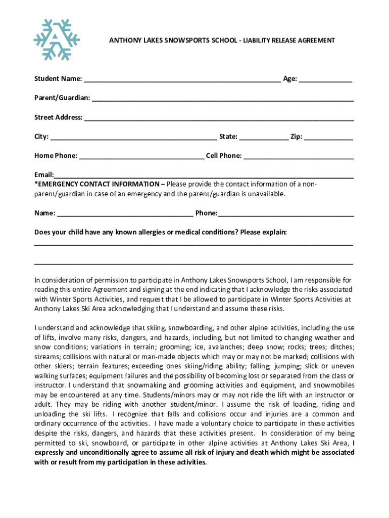 ANTHONY LAKES SNOWSTORMS SCHOOL LIABILITY RELEASE AGREEMENTStudent Name: Age: Parent/Guardian: Street Address: City: State: Zip: Home Phone: Cell Phone: Email: *EMERGENCY CONTACT INFORMATION Please