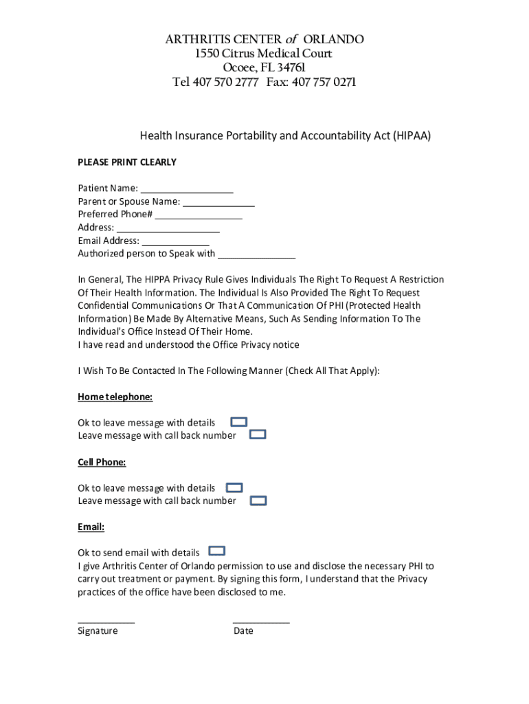ARTHRITIS CENTER of ORLANDO 1550 Citrus Medical Court Ocoee, FL 34761 Tel 407 570 2777 Fax: 407 757 0271HealthInsurancePortabilityandAccountabilityAct(HIPAA)PLEASEPRINTCLEARLY PatientName: ParentorSpouseName: