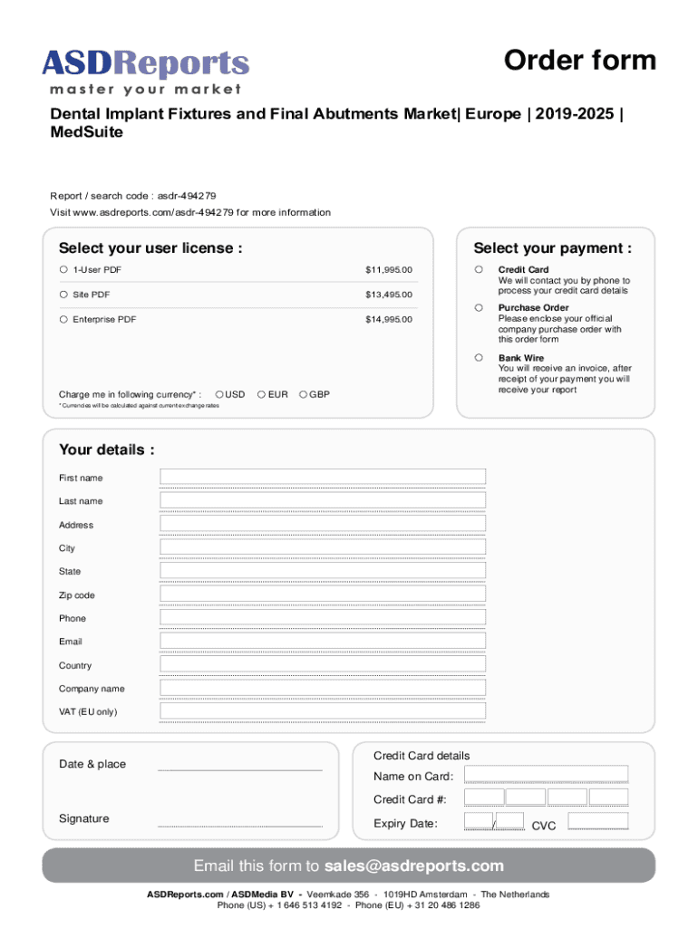 Order form Dental Implant Fixtures and Final Abutments Market Europe 20192025 MedSuiteReport / search code : asdr494279 Visit www.asdreports.com/asdr494279 for more informationSelect your user license