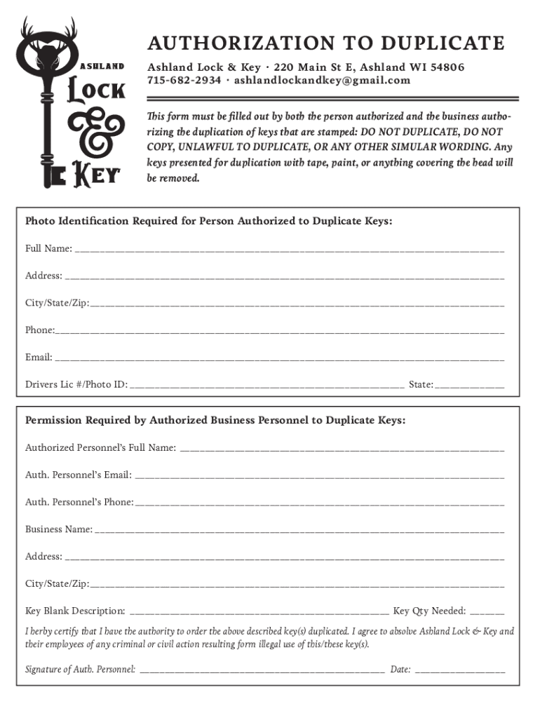 AUTHORIZATION TO DUPLICATE Ashland Lock & Key 220 Main St E, Ashland WI 54806 7156822934 ashlandlockandkey gmail.com This form must be filled out by both the person authorized and the business authorizing