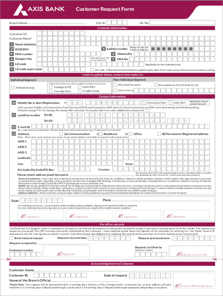 Customer Request Form Branch Names. No.SOL ID Customer InformationCustomer ID* Customer Name* Name Update DOB/DOI DD MM YYY(Please Provide lastYAadhaar number 4 digits of Aadhaar) Nationality PAN