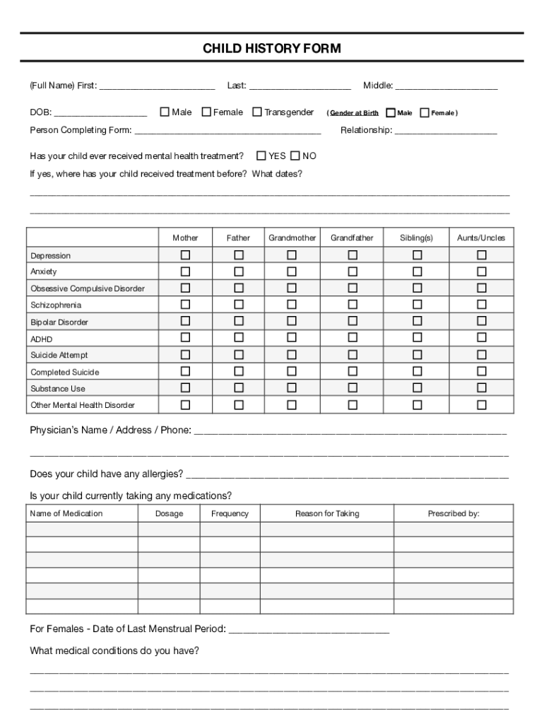 CHILD HISTORY FORM (Full Name) First: DOB: Ballast: FemaleTransgenderPerson Completing Form: Has your child ever received mental health treatment? Middle: (Gender at BirthMaleFemale)Relationship: