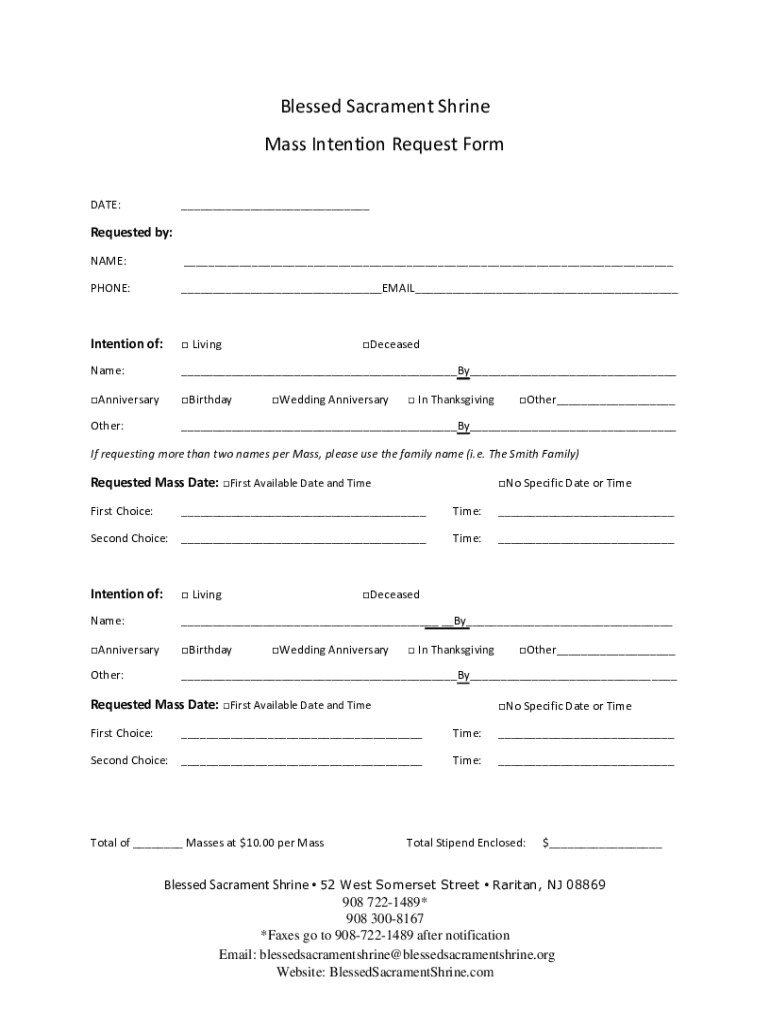 Blessed Sacrament Shrine Mass Intention Request Form DATE: Requested by: NAME: PHONE: EMAIL Intention of: LivingName: By AnniversaryBirthdayOther: By DeceasedWedding Anniversary In ThanksgivingOther