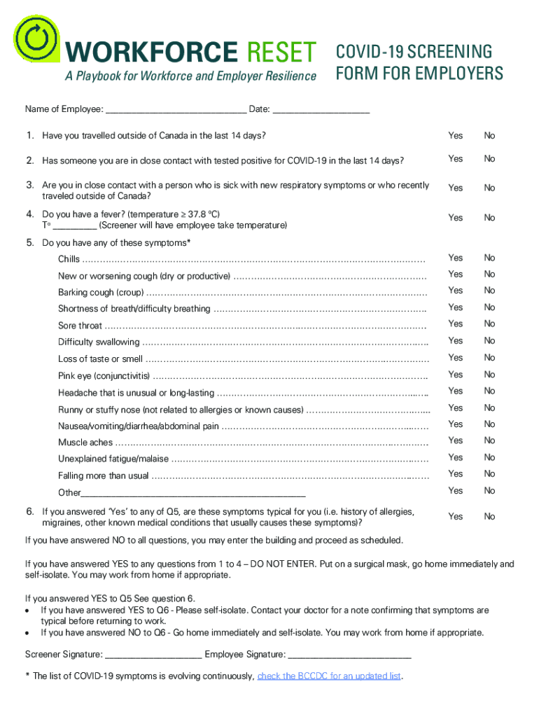 WORKFORCE RESET A Playbook for Workforce and Employer ResilienceCOVID19 SCREENING FORM FOR EMPLOYERSName of Employee: Date: 1. Have you travelled outside of Canada in the last 14 days? YesNo2. Has