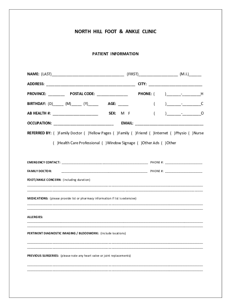 NORTH HILL FOOT & ANKLE CLINICPATIENT INFORMATIONAL: (LAST) (FIRST) (M.I.) ADDRESS: CITY: PROVINCE: POSTAL CODE: PHONE: () BIRTHDAY: (D) (M) (Y) AGE: () CAB HEALTH #: SEX:() OCCUPATION: MF EMAIL: