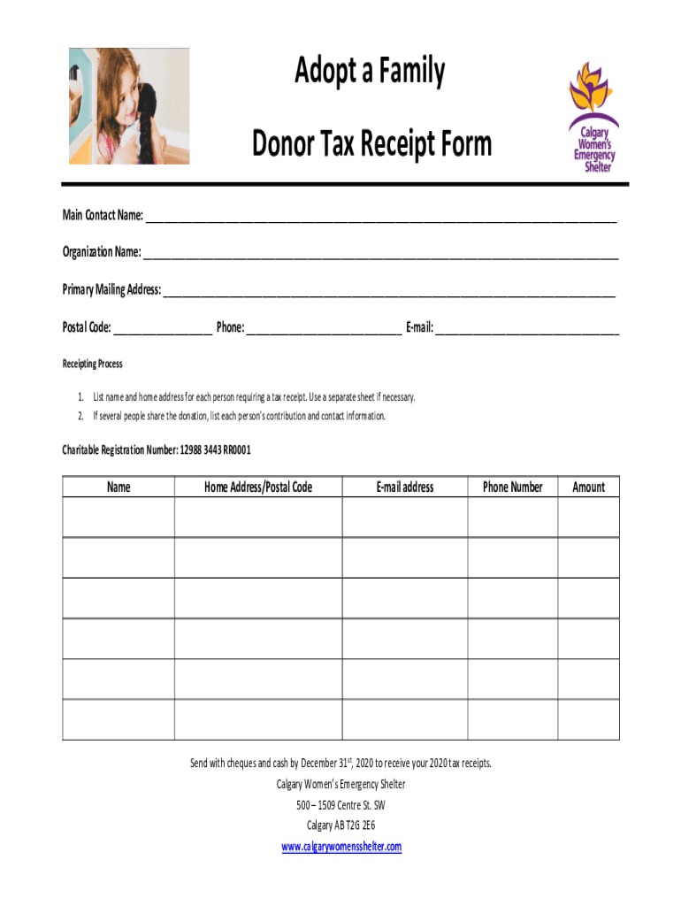 Adopt a Family Donor Tax Receipt Form Main Contact Name: Organization Name: Primary Mailing Address: Postal Code: Phone: Email: Receipting Process 1. 2. List name and home address for each person