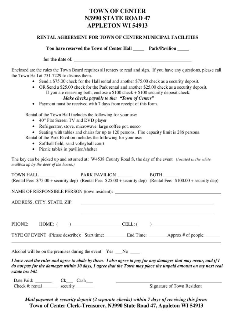 TOWN OF CENTER N3990 STATE ROAD 47 APPLETON WI 54913 RENTAL AGREEMENT FOR TOWN OF CENTER MUNICIPAL FACILITIES You have reserved the Town of Center Hall Park/Pavilion for the date of: Enclosed are