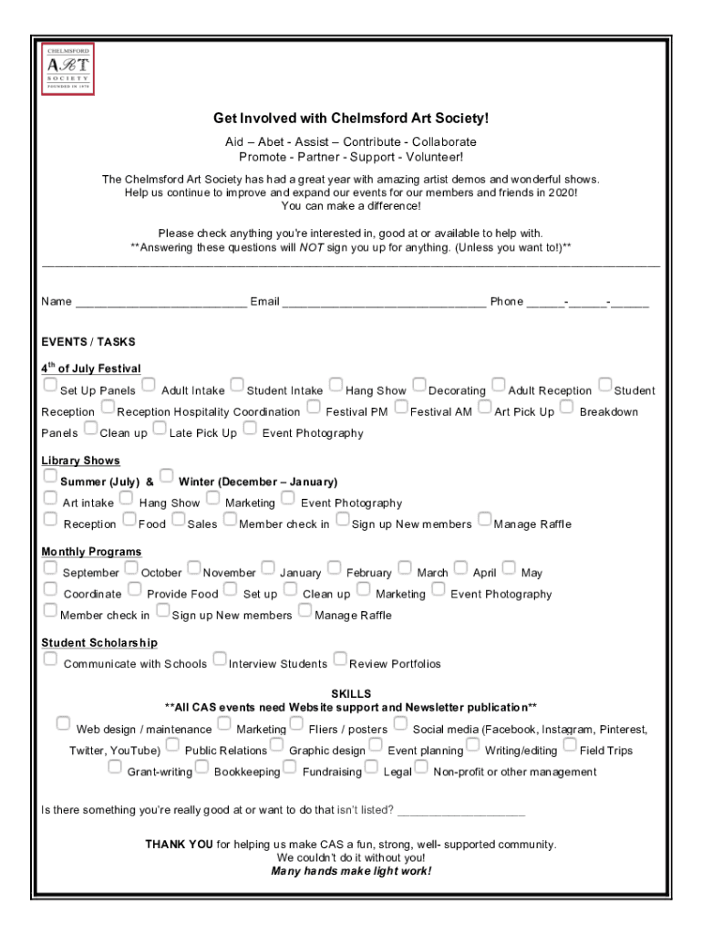 Get Involved with Chelmsford Art Society! Aid Abet Assist Contribute Collaborate Promote Partner Support Volunteer! The Chelmsford Art Society has had a great year with amazing artist demos and wonderful