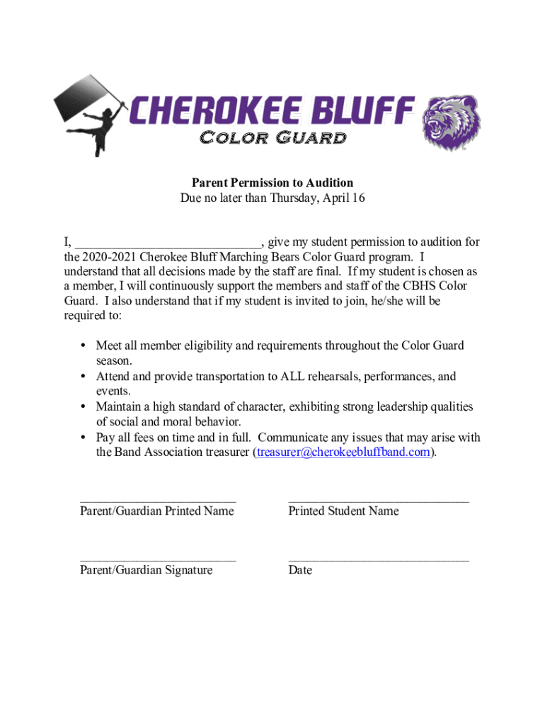 Color Guard Parent Permission to Audition Due no later than Thursday, April 16 I, give my student permission to audition for the 20202021 Cherokee Bluff Marching Bears Color Guard program. I understand