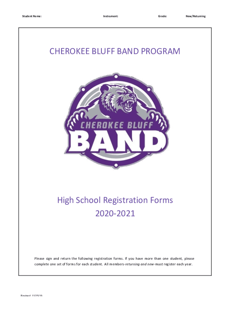 Student Name:Instrument:Grade:New/ReturningCHEROKEE BLUFF BAND Programming School Registration Forms20202021Pleasesignandreturnthefollowingregistrationforms. Ifyouhavemorethanonestudent, please complete