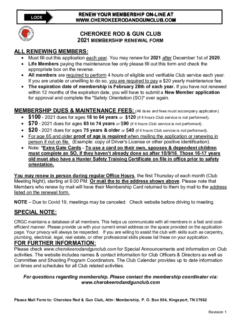 LOOSENED YOUR MEMBERSHIP ONLINE AT WWW.CHEROKEERODANDGUNCLUB.CHEROKEE ROD & GUN CLUB 2021 MEMBERSHIP RENEWAL FORM ALL RENEWING MEMBERS: Must fill out this application each year. You may renew for
