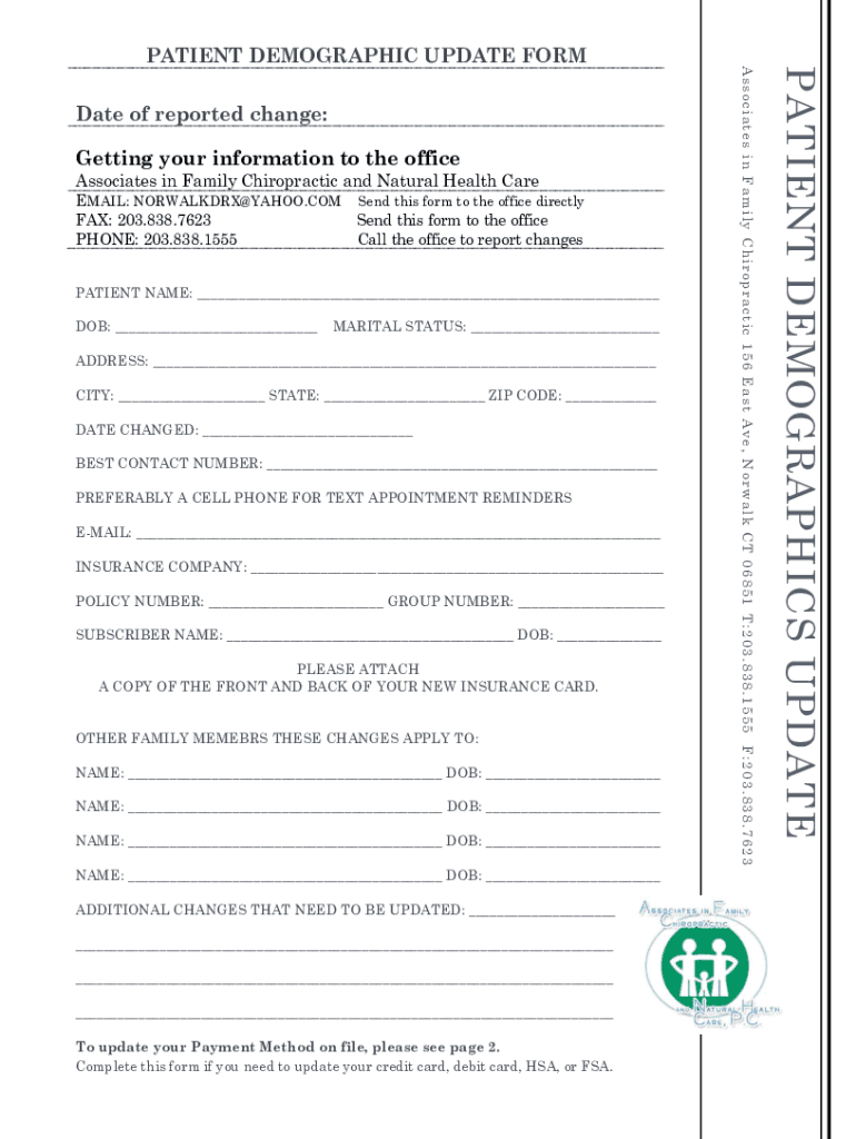 Getting your information to the office Associates in Family Chiropractic and Natural Health Care EMAIL: NORWALK YAHOO.COM Send this form to the office directly FAX: 203.838.7623 Send this form to