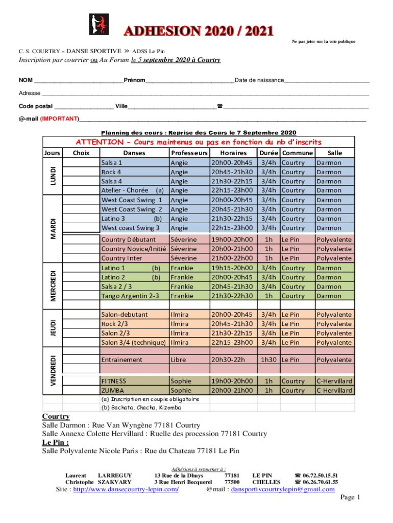 Ne's pas Peter SUR la voice public. S. COUNTRY DANCE SPORTIVE ADDS Le Inscription par courier of Au Forum LE 5 September 2020 Country NOT Prom Date de Renaissance Address Code postal Villa mail (IMPORTANT)