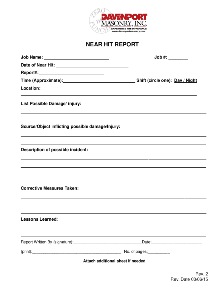 NEAR HIT REPORT Job Name: Job #: Date of Near Hit: Report#: Time (Approximate): Shift (circle one): Day / Night Location: List Possible Damage/ injury: Source/Object inflicting possible damage/Injury: