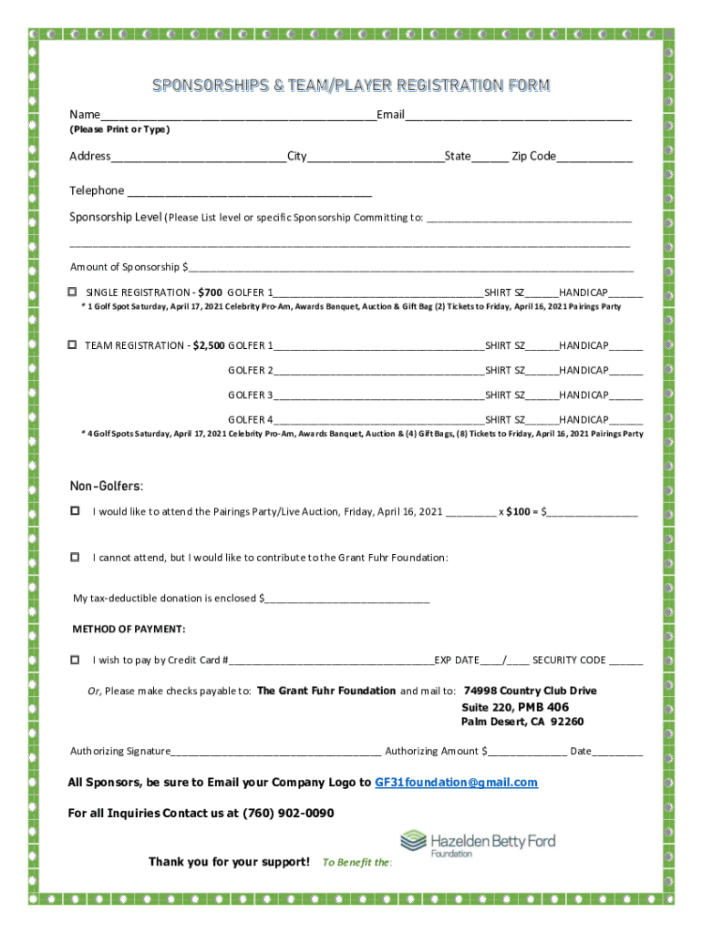 Name Email (Please Print or Type)Address City State Zip Code Telephone Sponsorship Level (Please List level or specific Sponsorship Committing to: Amount of Sponsorship $ SINGLE REGISTRATION $700