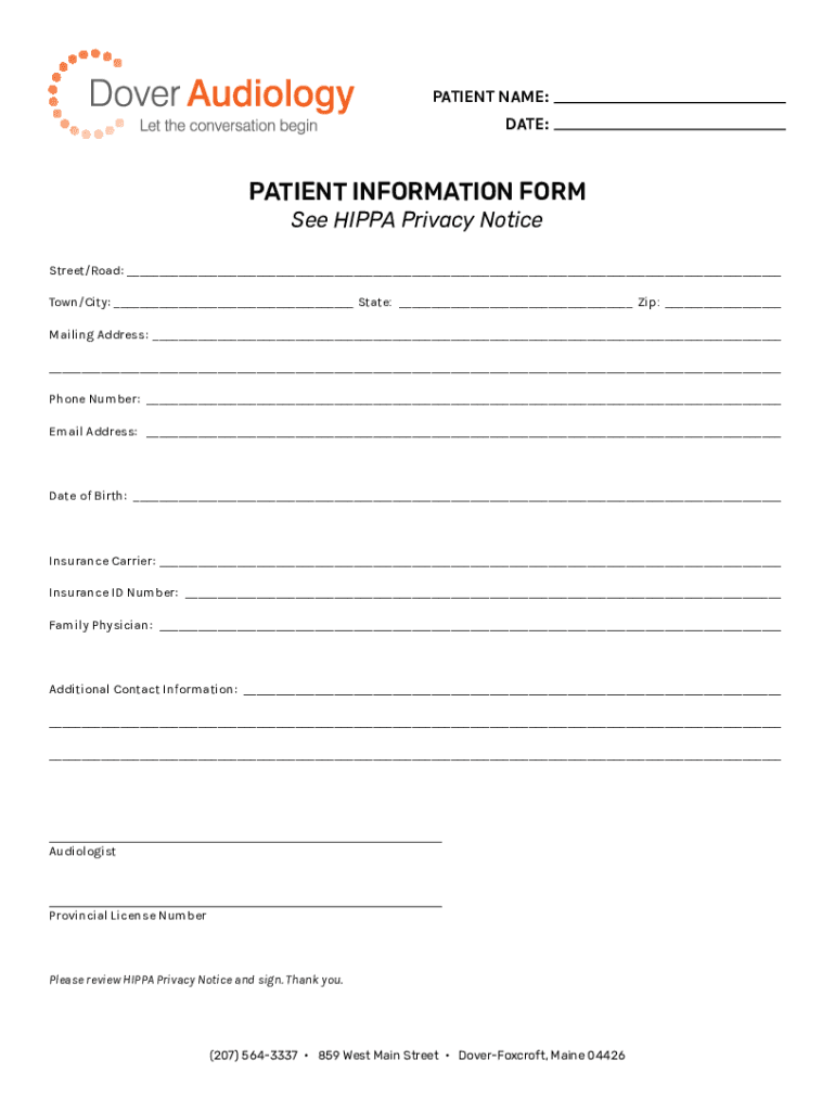 PATIENT NAME:DATE:PATIENT INFORMATION FORM See HIPPO Privacy NoticeStreet/Road: Town/City: State: Zip: Mailing Address: Phone Number: Email Address: Date of Birth: Insurance Carrier: Insurance ID