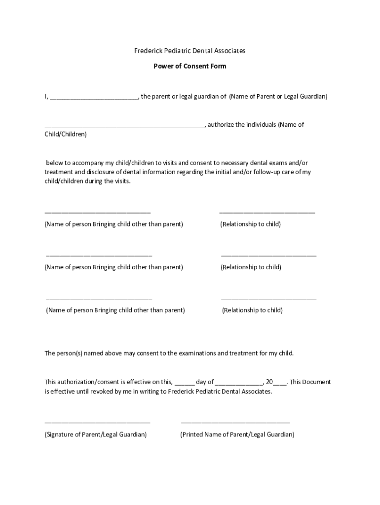 Frederick Pediatric Dental Associates Power of Consent Form, the parent or legal guardian of (Name of Parent or Legal Guardian), authorize the individuals (Name of Child/Children)below to accompany