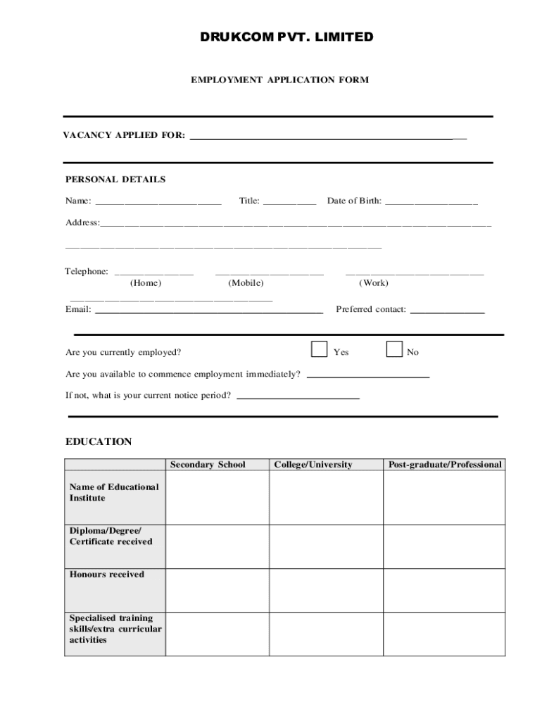 DRUM PVT. LIMITEDEMPLOYMENT APPLICATION FORMVACANCY APPLIED FOR: PERSONAL DETAILS Name: Title: Date of Birth: Address: Telephone: (Home) (Mobile) (Work) Email: Preferred contact: Are you currently