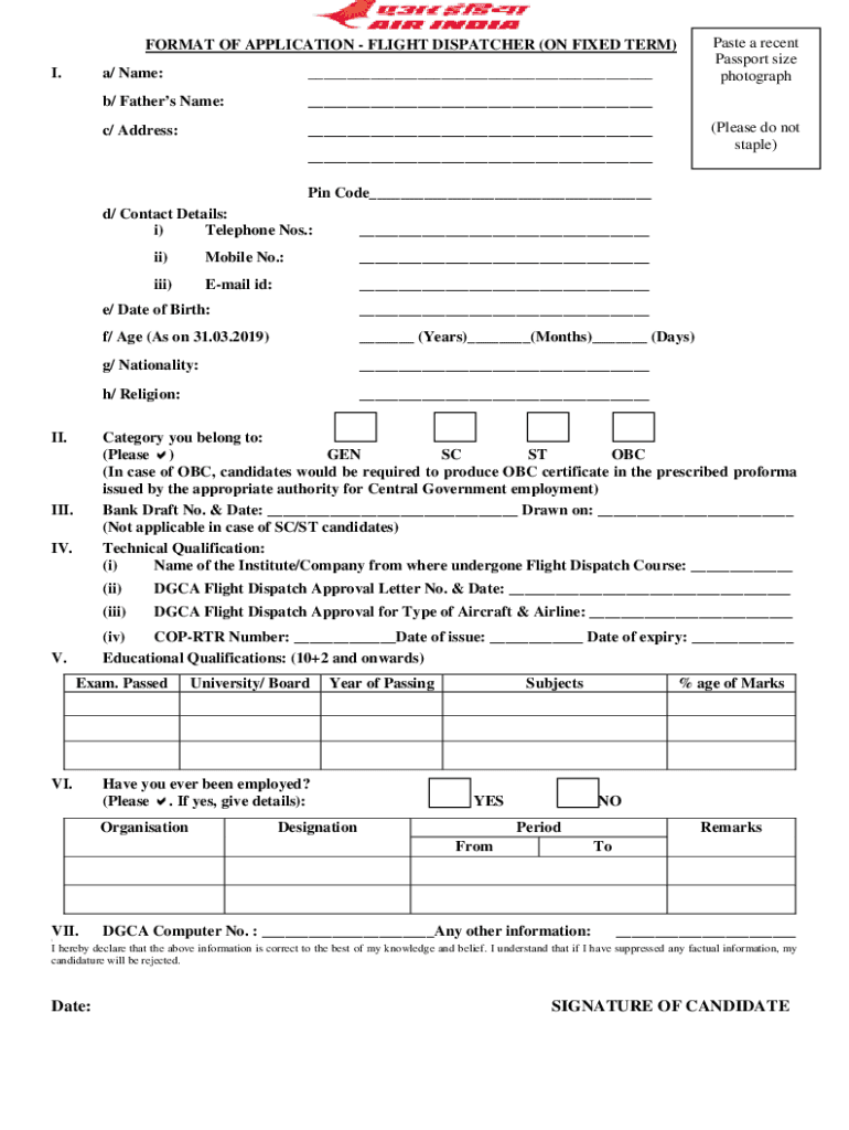 Paste a recent Passport size photographFORMAT OF APPLICATION FLIGHT DISPATCHER (ON FIXED TERM) I.a/ Name: b/ Fathers Name: c/ Address: (Please do not staple) Pin Code d/ Contact Details: i) Telephone