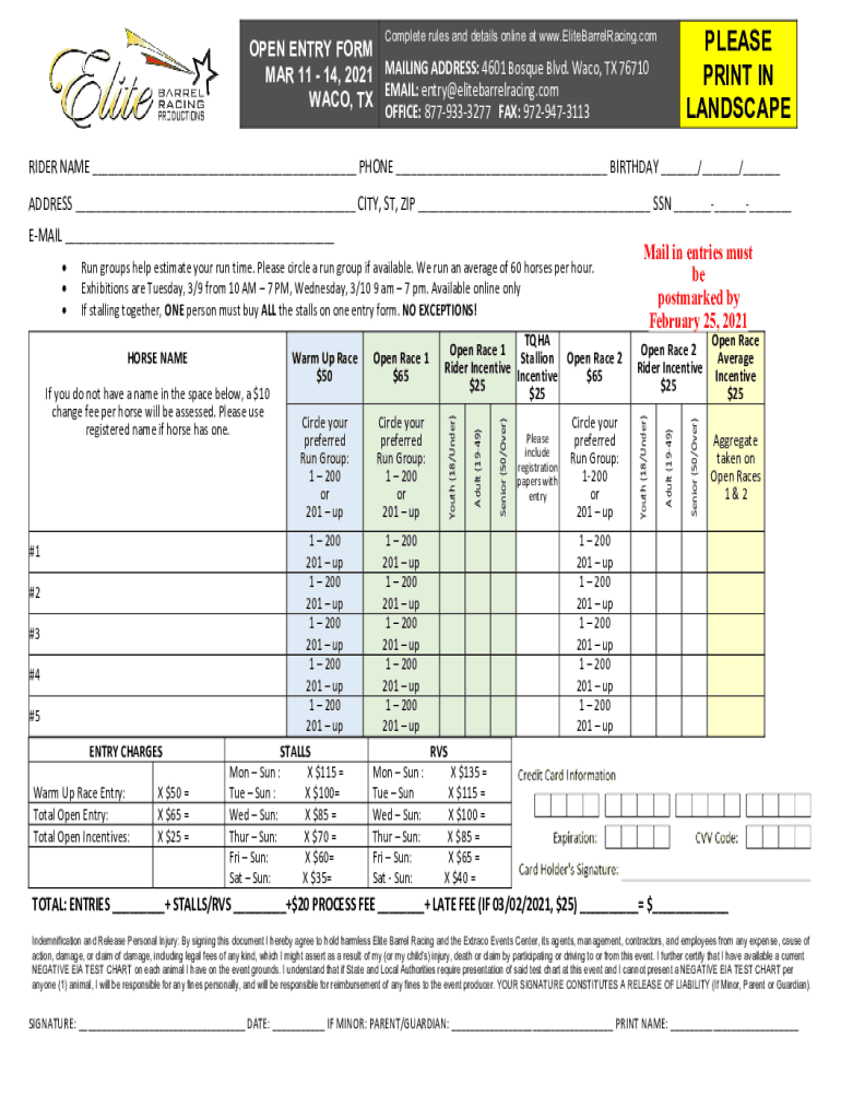 PLEASE PRINT IN LANDSCAPEComplete rules and details online at www.EliteBarrelRacing.comOPEN ENTRY FORM MAR 11 14, 2021 MAILING ADDRESS: 4601 Mosque Blvd. Waco, TX 76710 EMAIL: entry elitebarrelracing.com