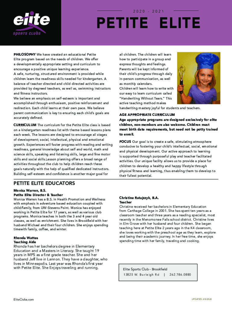 2020 2021PETITE ELITE PHILOSOPHY We have created an educational Petite Elite program based on the needs of children. We offer a developmentally appropriate setting and curriculum to encourage a positive