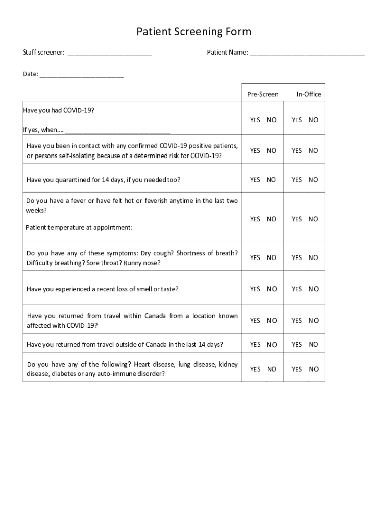 Patient Screening Form Staff screener: Patient Name: Date: PreScreenInOfficeHave you had COVID-19? YES NOYES Mohave you have been in contact with any confirmed COVID-19 positive patients, or persons