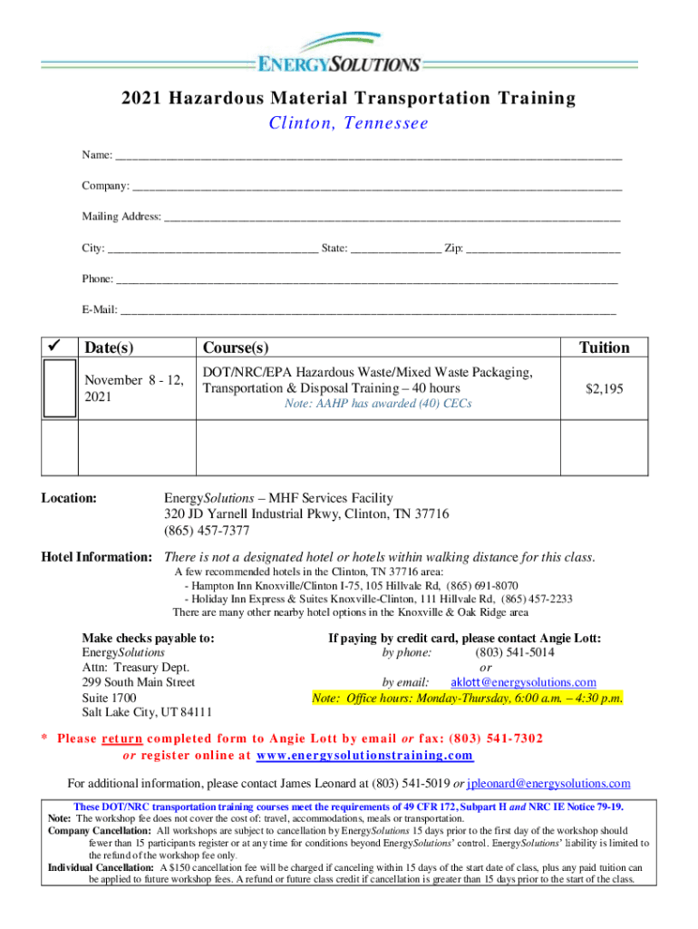 2021 Hazardous Material Transportation Training Clinton, Tennessee Name: Company: Mailing Address: City: State: Zip: Phone: Email: Date(s)Course(s)November 8 12, 2021Location:Tuition DOT/NRC/EPA Hazardous