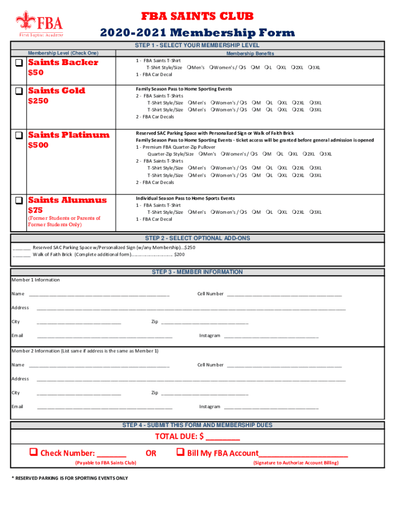 FBA SAINTS CLUB 20202021 Membership Form STEP 1 SELECT YOUR MEMBERSHIP LEVEL (Check One)Membership Benefits Saints Backer1 FBA Saints Shirt Style/Size men's women's / ms mm mL Mel m2XL m3XL 1 FBA