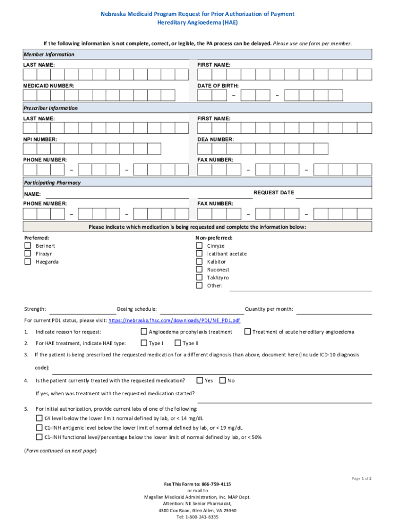 Get the free Nebraska Medicaid Hereditary Angioedema (HAE) Prior Authorization Fax Form. Heredita...