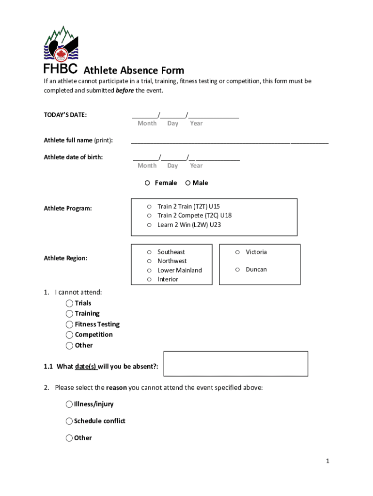 Athlete Absence Formic an athlete cannot participate in a trial, training, fitness testing or competition, this form must be completed and submitted before the event. TODAYS DATE: / / Month Day Triathlete
