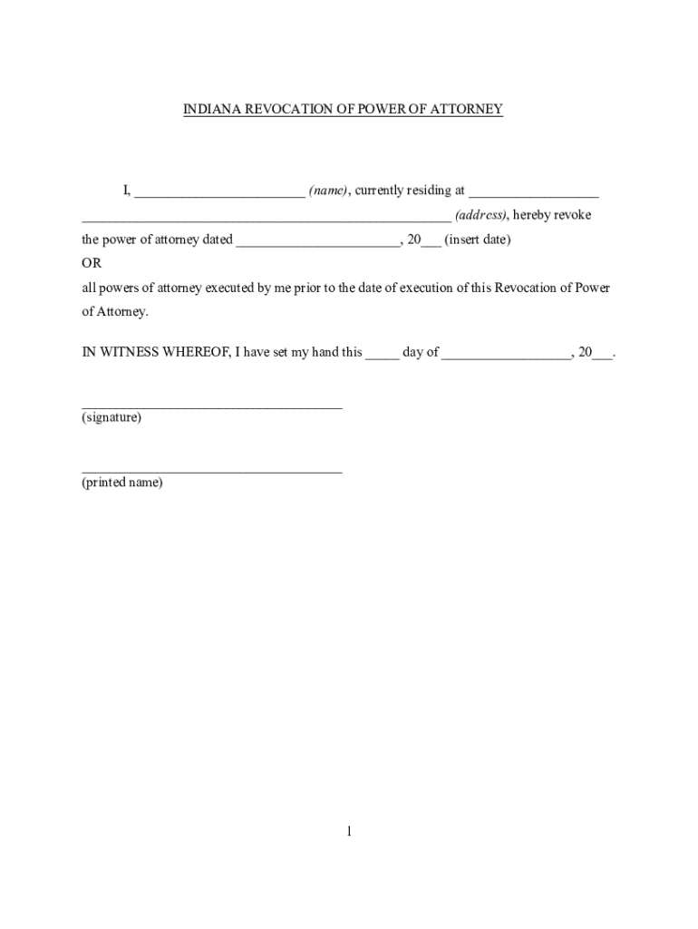 INDIANA REVOCATION OF POWER OF ATTORNEY, (name), currently residing at (address), hereby revoke the power of attorney dated, 20 (insert date) OR all powers of attorney executed by me prior to the