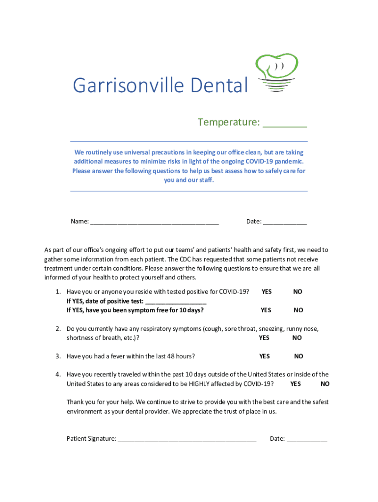 Garrisonville Dental Temperature: We routinely use universal precautions in keeping our office clean, but are taking additional measures to minimize risks in light of the ongoing COVID-19 pandemic.