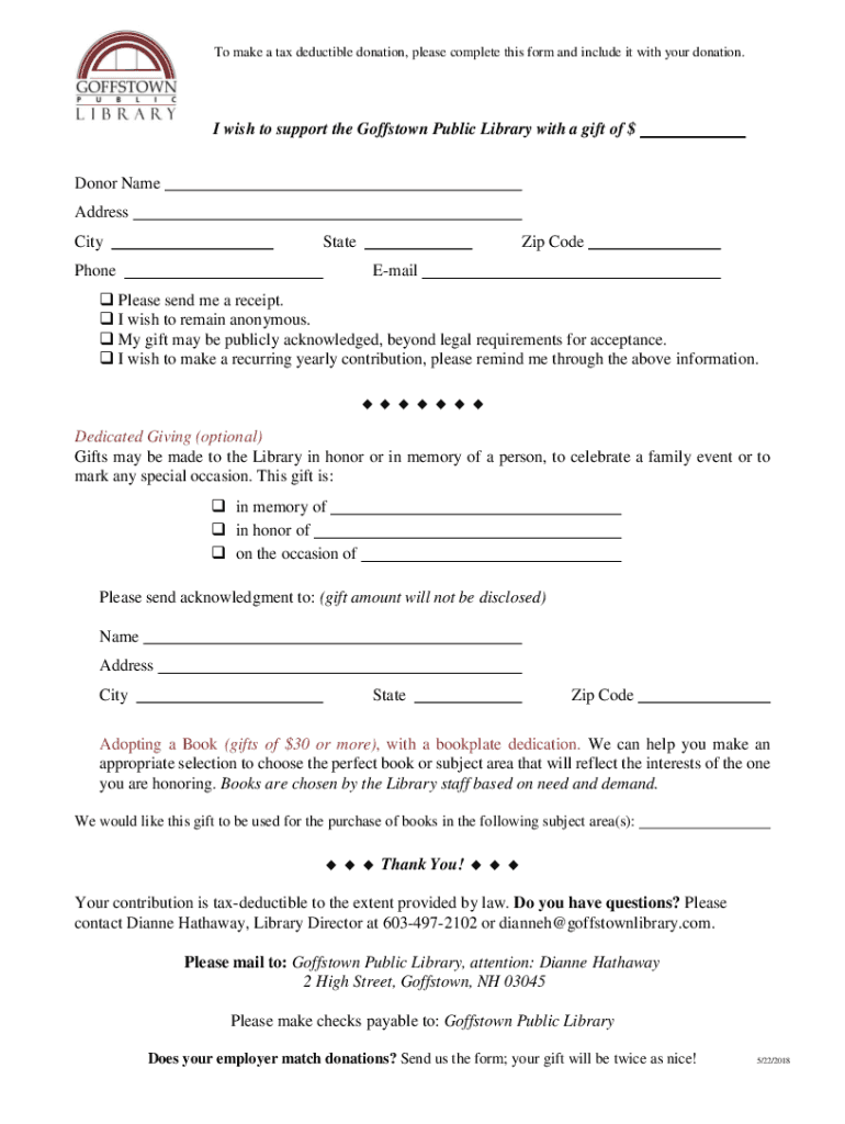 To make a tax-deductible donation, please complete this form and include it with your donation. I wish to support the Goffstown Public Library with a gift of $ Donor Name Address CityStatePhoneZip