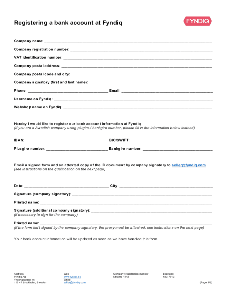 Registering a bank account at Find Company name: Company registration number: VAT identification number: Company postal address: Company postal code and city: Company signatory (first and last name):