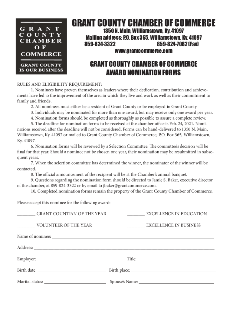 GRANT COUNTY CHAMBER OF COMMERCE1350 N. Main, Williams town, Ky. 41097